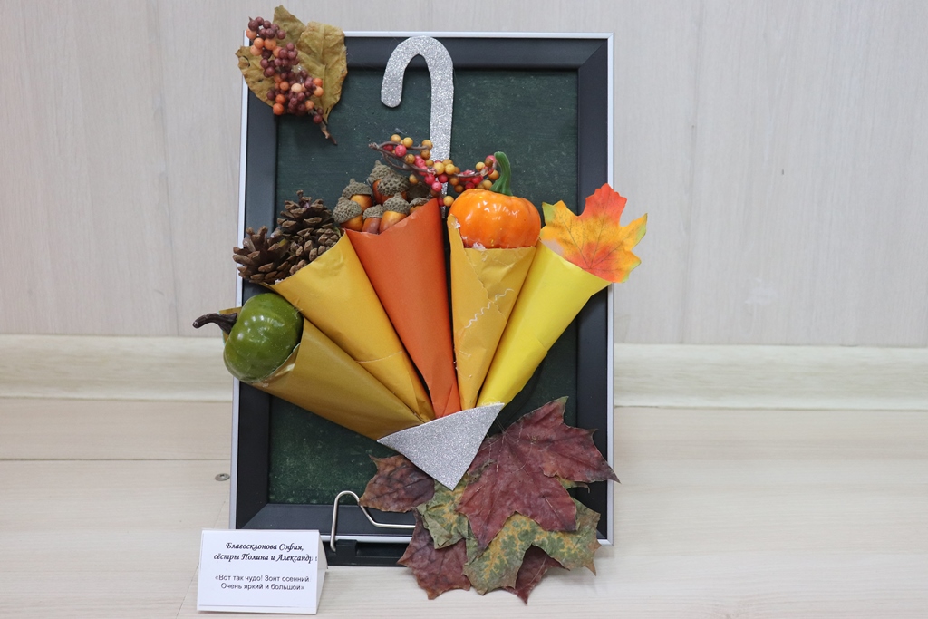 Осень - замечательное, яркое, необычное время года, когда, гуляя по улице с ребенком, взрослые могут не только собрать букет из желтых листьев, но и другой природный материал. Шишки, жёлуди, блестящие каштаны и цветы, травы, семена деревьев и кустарников, колосья, веточки и корни – настоящий кладезь для художественного творчества с природным материалом. Каждую осень, по традиции, у нас в детском саду проводится выставка творческих работ из природного материала, выполненных детьми совместно с родителями. В этом году наша выставка называлась «Осенние фантазии с зонтиком». Ребята вместе с родителями постарались и создали замечательные работы, различные осенние композиции из природного материала. Полюбоваться выставкой приходили дети, родители, сотрудники детского сада.