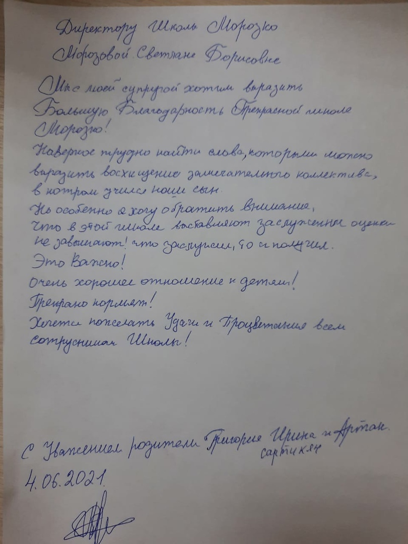 Наша семья - родители, бабушки и дедушки, хочет высказать слова благодарности нашим замечательным учителям, воспитателям, персоналу школы Морозко за из нелегкий труд, за внимательное отношение к нашим детям. Мы за все время ни разу не столкнулись с равнодушным отношением. Нас всегда встречают с улыбкой. Мы знаем все, что происходит в нашей школе, чем занимаются дети. А интересных занятий в школе и садике организовано очень много. Каждый день происходит что-то интересное. То неделя математики, то олимпиады, какие-то конкурсы, занятия. Особые слова благодарности хотелось бы сказать за детские праздники. То, как проводятся в нашей школе праздники - это особая тема. Это всегда ярко, красиво, столько песен, танцев, прекрасные костюмы. Все дети участвуют. После периода дистанционного обучения в прошлом году, когда и уроки, и мероприятия проводились онлайн, мы были рады прийти в прекрасный, уютный, красивый концертный зал во дворце Салют. Какое мы все получили удовольствие от спектакля! Мы понимаем, сколько труда затрачено нашими учителями, которые готовили деток к выступлениям! Это дорогого стоит в прямом и переносном смысле этого слова. Люди пришли семьями смотреть на это чудесное мероприятие, которое было проведено на самом высоком уровне. Какие молодцы! Спасибо всем, кто принял участие в его организации! И конечно - администрации. Организовать такие праздники нелегко, но сколько радости у детей и родителей смотреть, чему научились наши детишки, как они растут, какие они замечательные, талантливые. И все это нужно им. Видим, как нашим детям нравится ходить в школу и детский садик. Они бегут туда с большой радостью, а это и есть счастье для родителей, бабушек и дедушек. Ведь самое ценное для нас - наши дети. Мы рады, что они в надежных руках. Спасибо за труд и внимание всем нашим педагогам! Хочется назвать всех, кто заботится о наших детях ежедневно - Ирина Николаевна, Людмила Николаевна, Елена Викторовна, Оксана Юрьевна, Аида Алексеевна, Наталья Борисовна, Галина Юрьевна, Максим Александрович, Анна Александровна и всем, всем нашим учителям большое спасибо!